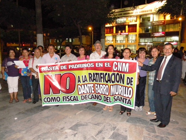 Chimbotenlinea.com (Por: Lindberg Cruzado).- Un grupo de abogados y maestros realizó anoche una vigilia en la plaza de armas de Chimbote en contra de la ratificación del fiscal superior decano Hugo Dante Farro Murillo. Coincidieron en que el cuestionado magistrado debería ser destituido del Ministerio Público porque su imagen le hace daño a su institución.