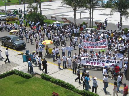 La multitudinaria marcha partió del campus de la Universidad César Vallejo, donde Sheyla cursaba el IX ciclo de Psicología, para luego dirigirse hasta al local del Ministerio Público en el distrito donde se detuvieron para pedir a una sola voz justicia para a joven asesinada.
