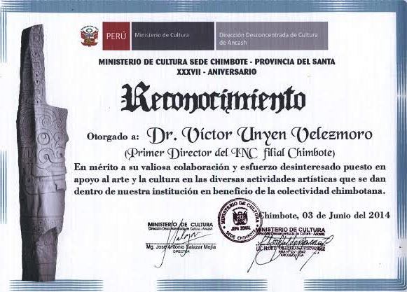 Chimbote en Línea (Cultural).-En el marco de celebración por el XXXVII Aniversario de creación del Instituto Nacional de Cultura de Chimbote, hoy Dirección Desconcentrada de Cultura de Áncash, la institución otorgó un reconocimiento al historiador porteño Víctor Nolberto Unyén Velezmoro, por su dedicado trabajo en pro del fotalecimiento del INC en nuestra ciudad.