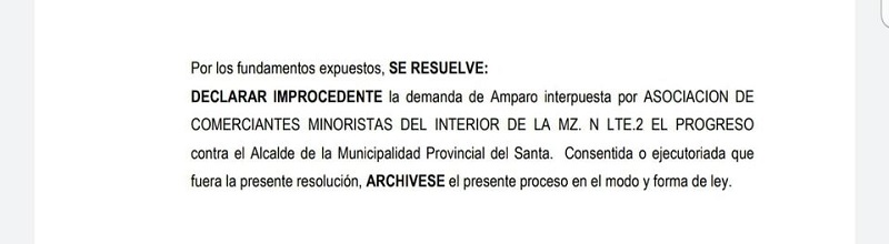 En ese sentido resuelve declarar improcedente la demanda de amparo interpuesta por Asociación de Comerciantes Minoristas del interior de la Mz. N Lte.2 El Progreso contra el alcalde de la Municipalidad Provincial del Santa. Consentida o ejecutoriada que fuera la presente resolución, archívese el presente proceso en el modo y forma de ley.