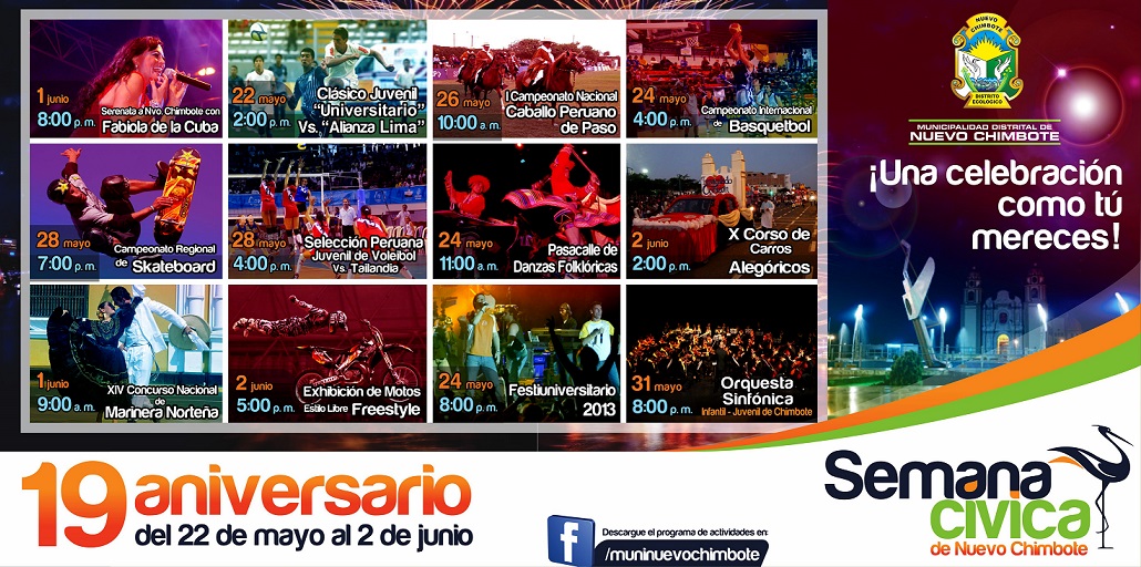 Chimbote en Línea (Nuevo Chimbote).- Más de 50 actividades culturales, educativas, deportivas y de proyección social, se desarrollarán en el marco del 19 Aniversario de Creación Política de Nuevo Chimbote. La fiesta empieza hoy con la coronación de la Miss Nuevo Chimbote, desde las 8 p.m. en la Plaza Mayor del distrito.