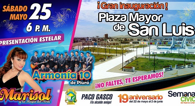 Y la actividad central más importante para la comuna sureña será sin duda la inauguración  de la Plaza Mayor de San Luis, el 25 de mayo a las 6 p.m. En esta gran fiesta estarán presentes las principales autoridades distritales y contará con la animación de las orquestas cumbiamberas del momento: Armonía 10 y Marisol con su orquesta “La Magia del Norte”.