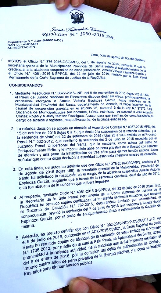 Chimbote en Línea.- En cuestión de horas la restituida alcaldesa de la provincia del Santa, Victoria Espinoza García, retornaría al despacho de la comuna, luego de que el Jurado Nacional de Elecciones remitiera a la Secretaría de la referida municipalidad la Resolución N° 1080-2016-JNE, con la cual se restituye las credenciales a la autoridad edil, quien se mantuvo en la clandestinidad durante más de 7 meses por un fallo judicial que pedía su encarcelamiento.