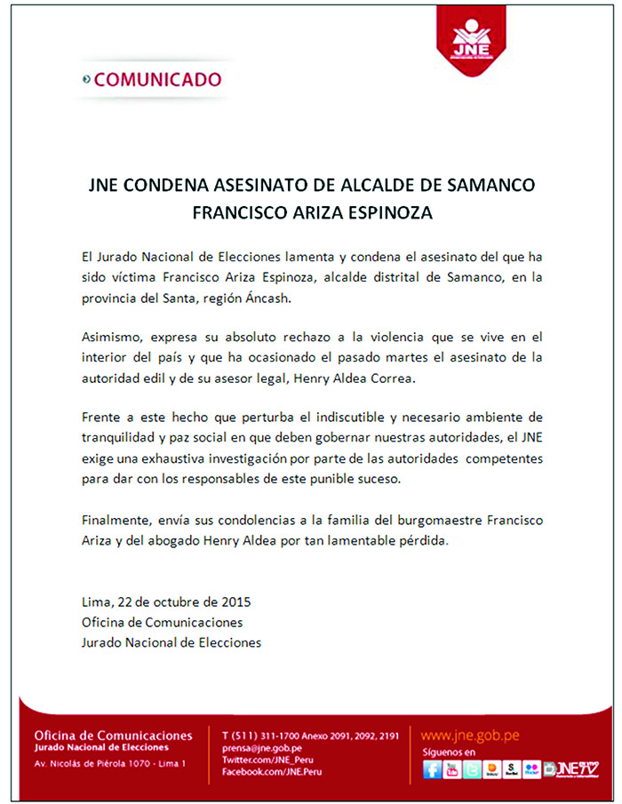 Chimbote en Línea.- A través de un comunicado el Jurado Nacional de Elecciones lamentó y condenó el asesinato del alcalde del Distrito de Samanco Francisco Ariza Espinoza, y el asesor legal de esa comuna, Henry Aldea Correa.