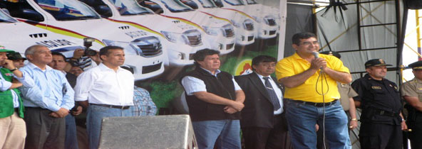 La ceremonia se realizó a la 1.30 p.m. en la Plaza Miguel Grau, donde el presidente regional César Álvarez Aguilar hizo entrega oficial de estos vehículos, que serán distribuidos a las diferentes comisarías de Ancash.