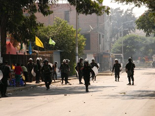 Los más de mil campesinos manifestantes respondieron arrojando piedras y rocas desde las alturas de los cerros, hecho que estuvo a punto de provocar el despiste de un trailer, sin embargo, fueron repelidos por los agentes del orden.